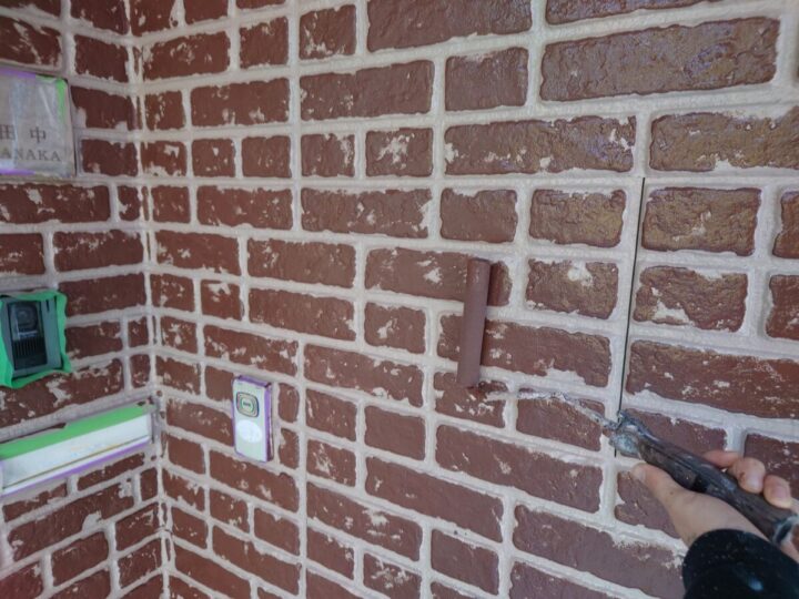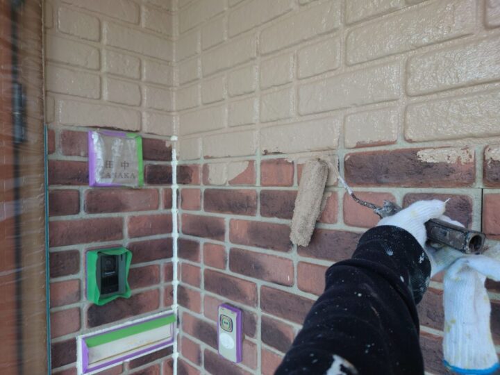 上塗2回目では下地を異なる色を塗ることにより、タイル調に仕上がります。