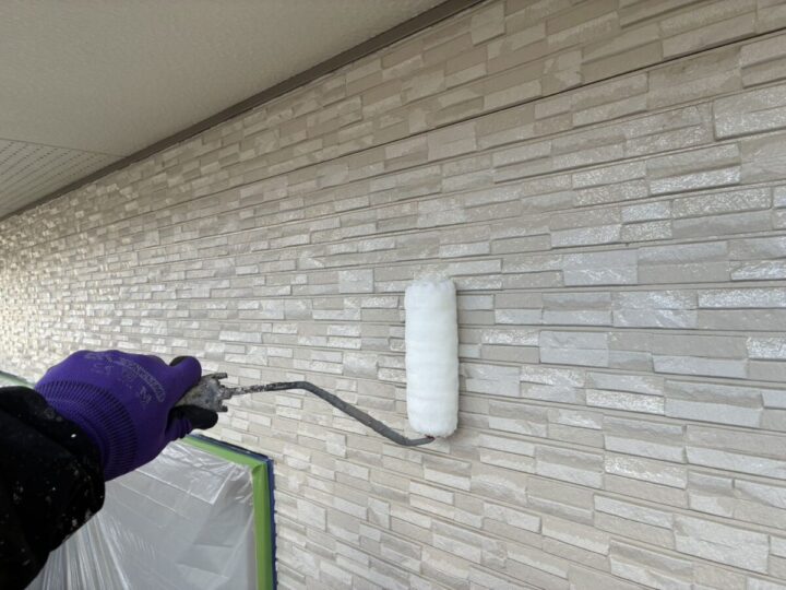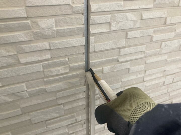 外壁の状態としましては、コーキングに傷みが見られている箇所があり、外壁の一部にひび割れが見られました。塗膜の劣化は見られず、綺麗な状態でした。メンテナンス内容としましては、塗膜はまだ元気な状態でしたので、今の外壁の模様を活かせるクリヤ塗装で透明の塗料で施工致しました。コーキングの打ち替えを行い、雨樋、破風板は外壁に合わせたお色で塗装致しました。