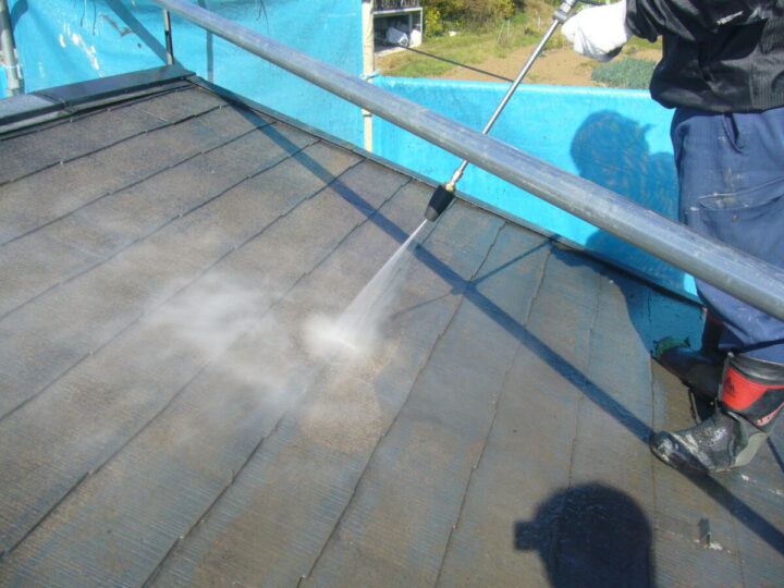 業務用の洗浄機を使用し、しっかりと汚れや苔を洗い流していきます。汚れが残っていると塗装してもすぐ剥がれてしまいます。