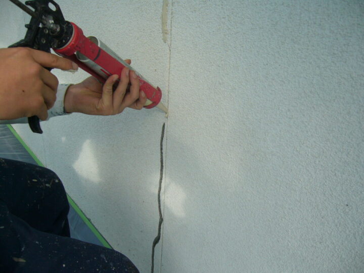 Uカットした箇所にコーキングを打設し、その上に樹脂モルタルで埋めていきます。