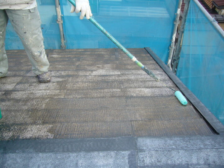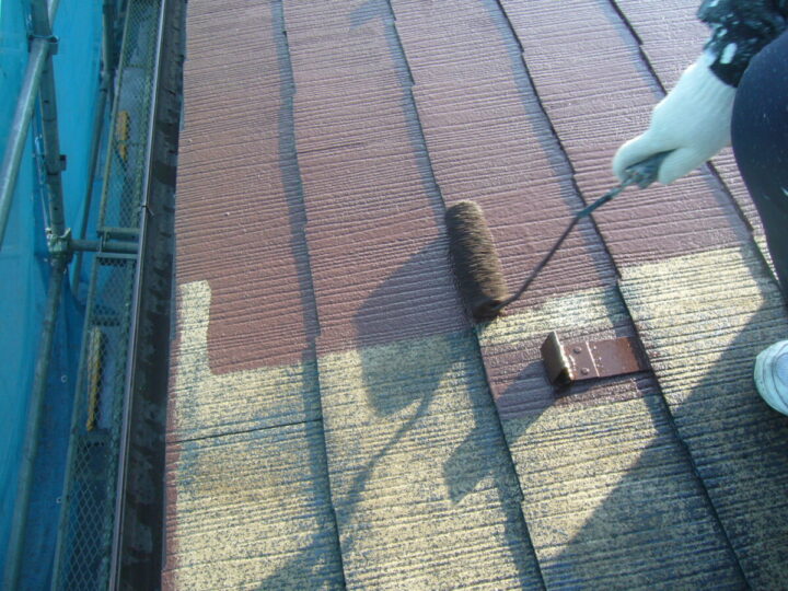 屋根材はスレートです。スレート材は塗料を吸い込むので、2回行いました。たっぷりと材料を使い固めることが大事です。