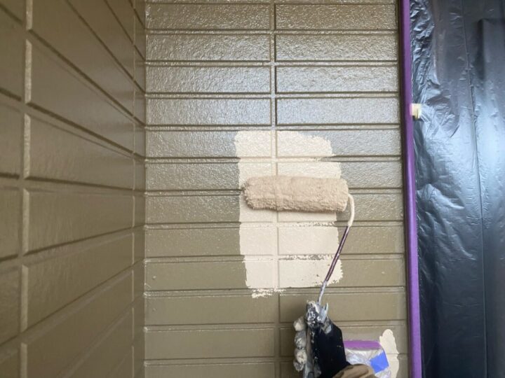 玄関ドアはシートを張ることで新品のような仕上がりになっています。それに合わせて玄関周りの塗装もご依頼頂きました。
