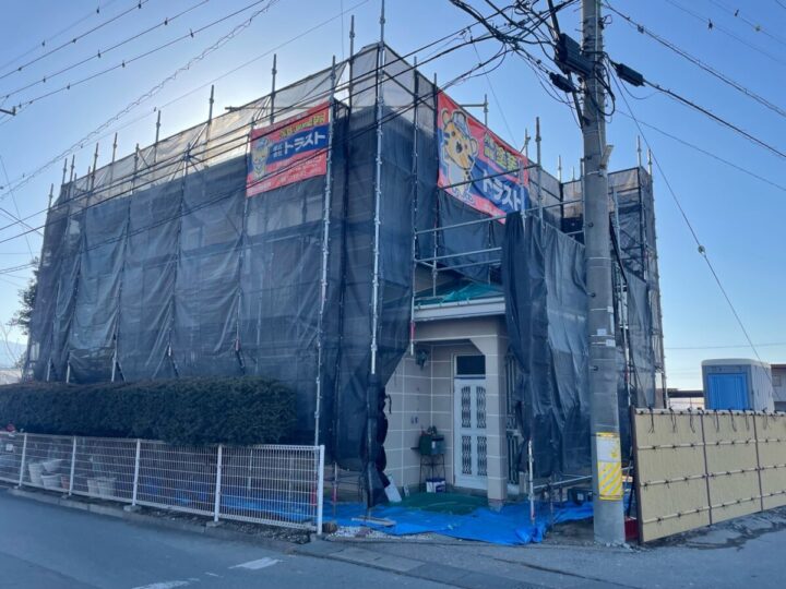 安全や周辺への飛散防止のために足場を仮設します。