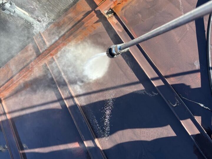 業務用の高圧洗浄機を使用して、汚れやごみを洗い流します。