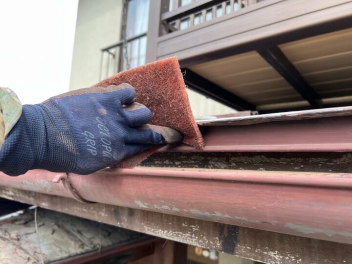 塗料の密着性を高めるため、表面に細かなキズをつけていきます。
