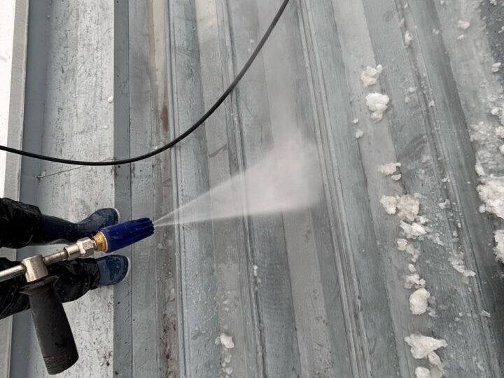 業務用の高圧洗浄機を使用して、汚れやごみを洗い流します。