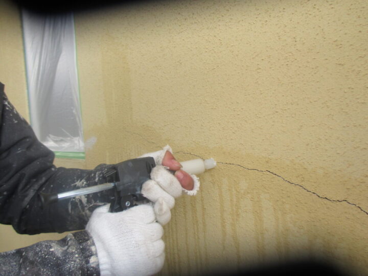 モルタル壁はひび割れが発生しやすいです。状況により補修材を使い分けひび割れの補修をしていきます。