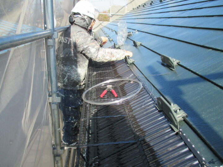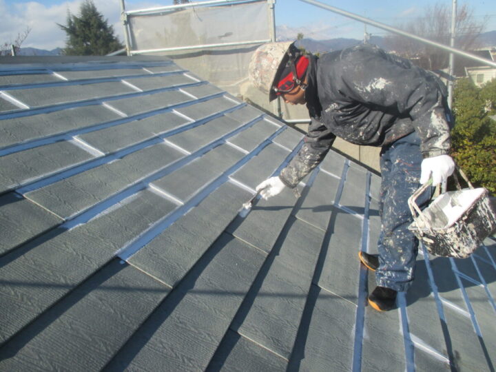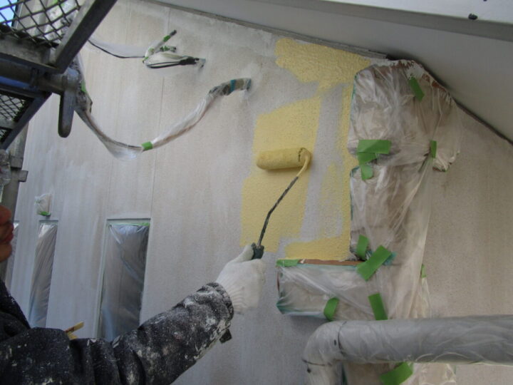 下塗り含めて3回塗装していきます。今回は水性塗料のエスケー化研プレミアムシリコンを使用いたしました。