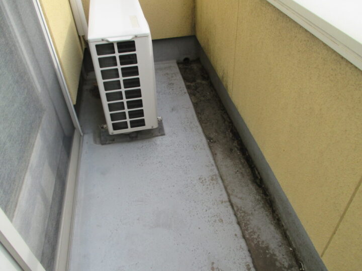 サッシが壁面よりも入り込んでいるため、サッシ下に水がたまり壁面を水が伝っている様子が見られます。