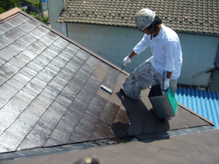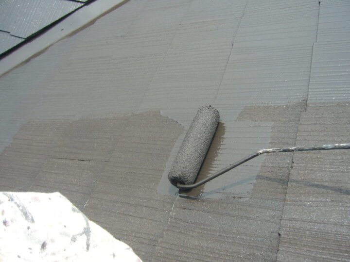 今回は、屋根材の表面に一部荒れが見られたため、塗料がしっかりと密着するように下塗りのプライマーを2回塗りで丁寧に吸い込ませました。